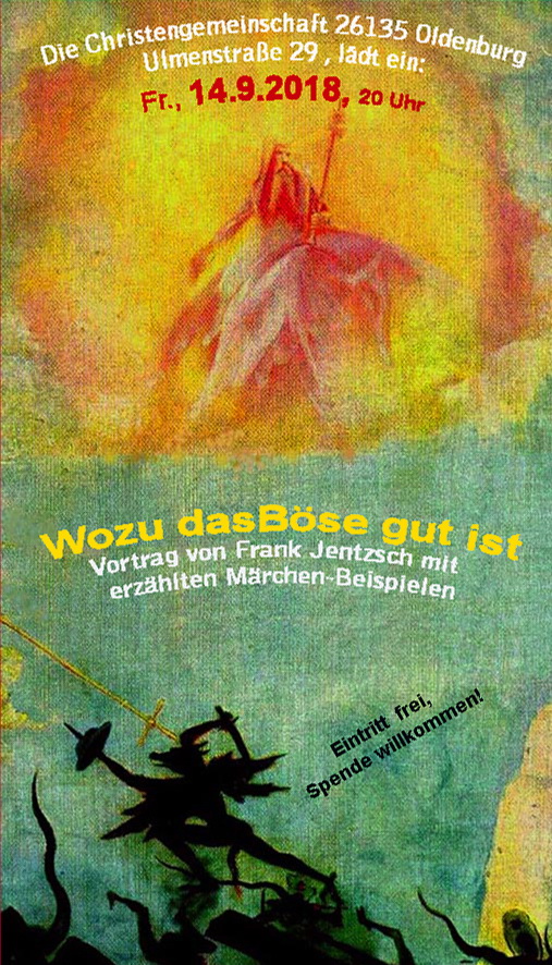 | Termine 2018 Mittwoch, 7.2.2018, 20 Uhr - Waldorfkindergarten 71065 Sindelfingen, Wengertstr. 5 Elternabend zum Thema Märchen" Dienstag, 20.3.2018, Grundschule Lienzingen , 75417 Mühlacker, Dr. Otto-Schneider-Str. 2 , Erzählen für 1.+2., und 3+4. Klasse Donnerstag, 3.5.2018, 19 Uhr Die Christengemeinschaft 73728 Esslingen, Landolingasse 12 Vortrag zum Thema "Religion und Märchen" mit erzählten Beispielen. Mo - Fr. , 6. - 11.8.2018 Waldorferzieher-Ausbildung in Sofia, Bulgarien Märchenerzähl- Seminar Dienstag, 11.9.2018, 20 Uhr Waldorfkindergarten 35394 Gießen, Altenfeldsweg 6, Vortrag und Gespräch zum Thema "Anthroposophie und Märchen" Eintritt Spende. Mittwoch, 12.9.2018, 19 UHr , Waldorfkindergarten 46117 Oberhausen, Rothebuschstr. 2, Vortrag und Gespräch zum Thema "Anthroposophie und Märchen" Eintritt Spende. Freitag, 14.9.2018, 20 Uhr Die Christengemeinschaft 26135 Oldenburg, Ulmenstraße 29 Vortrag "Wozu ist das Böse gut ? " --> Plakat WEintritt Spende Montag, 17.9.2018, 20 Uhr Die Christengemeinschaft 26135 Oldenburg, Ulmenstraße 29 Frank Jentzsch erzählt das russische Märchen "Die schöne Wassilissa", anschließend Gespräch über die darin enthaltenen Sinnbilder. Eintritt Spende. Mittwoch, 19.9.2018, 19.30 Uhr Waldorfkindergarten 27472 Cuxhaven, Marienstraße 39 / 40 Heiterer Erzählabend mit Erläuterungen zu den Märchensinnbildern. ________________________________________________________________________________________ Donnerstag, 20.9.2018, 20.15 Uhr - Suse-König-Kindergarten 22609 Hamburg, Heimburgstraße 4 Elternabend zum Thema Märchen. Freitag, 21.9.2018 , 20 Uhr Waldorfkindergarten Wedel, 22880 Wedel, Am Redder 8a, Elternabend zum Thema "Märchen (und Medien)" mit erzählten Beispielen. Samstag, 22.9.2018 Waldorfkindergarten Wedel, 22880 Wedel, Am Redder 8a, Übungen zum Märchen-Erzählen, Auswendiglernen und Vorlesen, mit Erzieherinnen und interessierten Eltern 9 - 12 Uhr und 14 -17 Uhr. ________________________________________________________________________________________________ Dienstag, 6.11.2018, 15 Uhr 30 Seniorenkreis 70569 Stuttgart-Vaihingen-Lauchäcker, Meluner Str. 12, Erzähl-Café Sonntag, 11.11.2018, 19 Uhr beim Erzähler 70619 Stuttgart, Davoser Weg 8, Russische Märchen (auf Deutsch), und Elena singt Russische Lieder (auf Russisch) Eintritt 10 Euro, Unbedingt vorher anmelden, ob noch Plätze frei sind: Tel. 0711 - 935 60 42 oder über mail(at)maerchenfrank.de Sonntag, 18.11.2018, 19 Uhr beim Erzähler 70619 Stuttgart, Davoser Weg 8, Übungen für Interessierte zum Vorlesen, Erzählen und Auswendiglernen. Eintritt 10 Euro. Unbedingt vorher anmelden, ob noch Plätze frei sind: Tel. 0711 - 935 60 42 oder über mail(at)maerchenfrank.de Sonntag, 9.12.2018, nachmittags Erzählen beim Schwimmerbund Schwaben, Taldorfer Str. 33, 70599 Stuttgart. Sonntag, 16.12.2018, nachmittags Erzählen beim Öfinger Weihnachtszauber, 78073 Bad Dürrheim, Öfingen, ehemalige Reithalle Raiffeisenweg.
